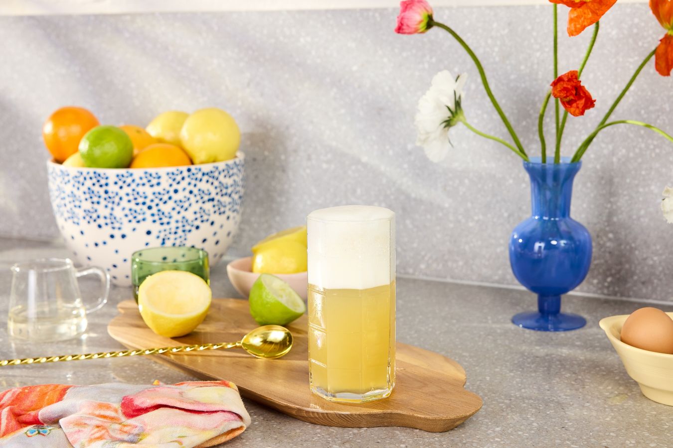 Conor’s first tip? Throw on some daydreamy music, like Solange’s ‘Cranes in the Sky’ or Frank Ocean’s ‘Ivy’ to get your creative cocktail-making juices flowing. The next step is to prep your glasses. “Make sure you have a few chilled glasses in the freezer ready to go,” explains Conor. We suggest serving this drink in a highball glass to get as much out of that lovely foamy top as possible. Because this drink has an egg-white element to it, it's important to shake the crap out of it. “Shake super hard. Super!” says Conor. “Then let it sit for a second before topping up with soda water.” If egg white makes your insides reel, you can sub it out for aquafaba (chickpea can juice) or Wonderfoam and still get that amazing foamy top. Level up the Morning Glory Fizz by adding a herb to the mix: “You could definitely play around with adding a herb to the sugar syrup, like a basil or rosemary,” explains Conor. “It will take the cocktail to a more herbaceous, even floral place.”