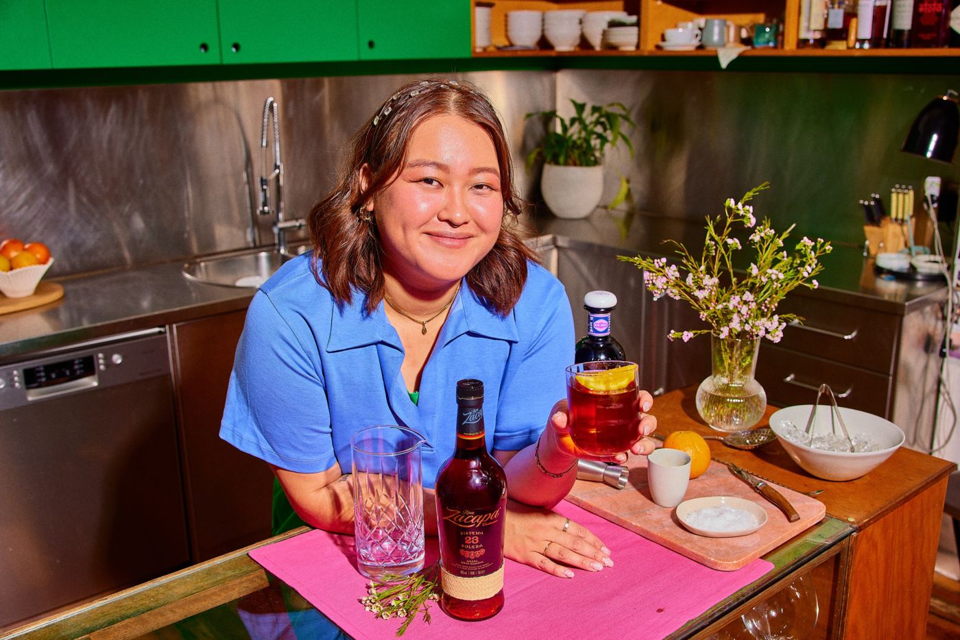 Back to the chocolatey goodness. This sophisticated sipper is wonderfully complex in flavour – a mix of dark rum, chocolate liqueur and sweet vermouth – without being annoyingly hard to make. It follows a very similar formula to that of an Old Fashioned and is just as cruisy to mix. “It really champions the rum, mixing in flavours of sweet and bitter chocolate cacao,” explains Shirley. “It’s actually a great drink for first-time Old Fashioned drinkers or the seasoned pro who wants a slight twist on an old fave.” Simply dump your ingredients into a mixing glass with ice, stir to combine and strain over a big chunk of ice in your fanciest rocks glass. “I love this drink because it honestly is so easy and simple to make at home or anywhere,” says Shirley. “And the molasses and soft spices in the dark rum come through very boldly, blending in with the same soft sweet and bitterness from the vermouth and creme de cacao, while that saline from the salt adds depth.”