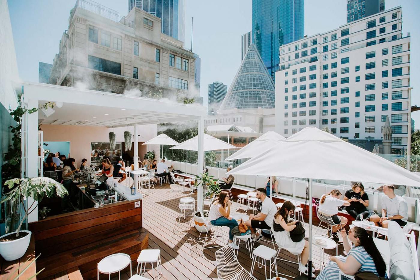 Typically Melbourne, an anonymous staircase leads to a rocking pizza restaurant, a cosy bar and a palm-lined rooftop with skyscraper views, adding up to three floors of fun in the CBD.