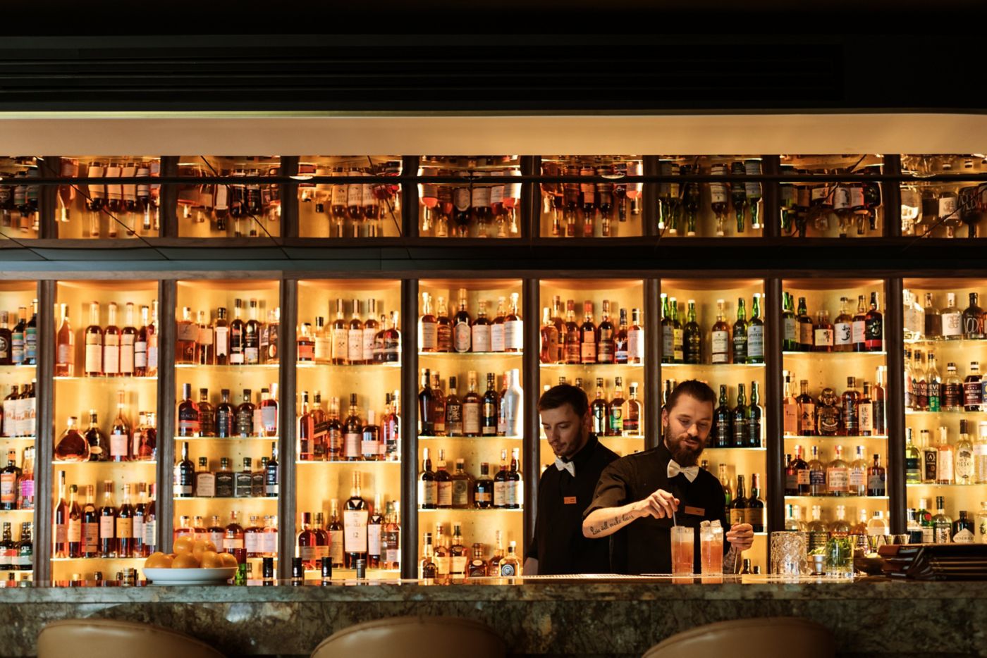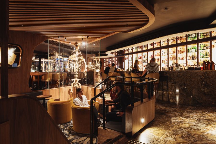 And then there’s the bar’s museum-like interior – the oldest bar décor imaginable. An extraordinary collection of fossils, skeletons and artefacts dating back 550 million years is dramatically lit and displayed in glass cabinets and shadow-box tables, so you find yourself reaching for your drink atop a cabinet filled with fossilised trilobites, crinoids and ammonites. Bigger artefacts include the nose horn of a triceratops, the enormous teeth of the shark-like megalodon, a mammoth tusk and the skull of a giant pig. A favourite is the dinosaur egg, a thing of beauty and wonder, from the nest of an armour-plated saltasaurus. Maintaining the museum vibe, the dazzling line-up of spirits bottles is lit and displayed in glass-fronted cases behind the main bar, like an extension of the natural-history collection.