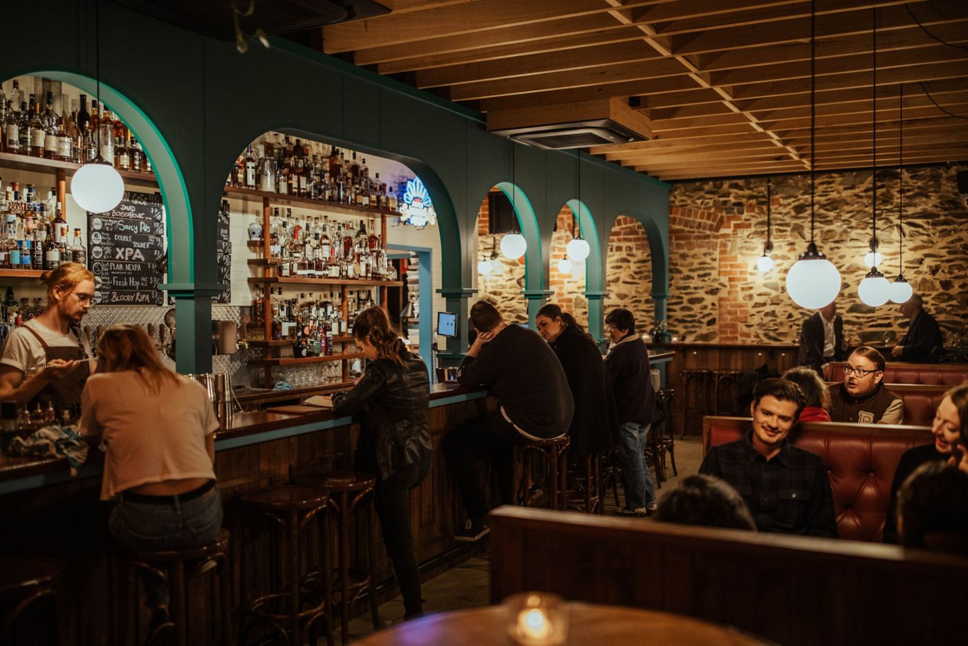 More than 200 whiskeys and whiskies have a strong showing from the rest of the world, including Australia, Scotland and Japan. And the 16 rotating tap beers (scrawled on a chalkboard above the bar) might be supplemented by a Moon Dog sour, a Little Bang Hazy IPA, and Denmark Wild Ale with white peach.