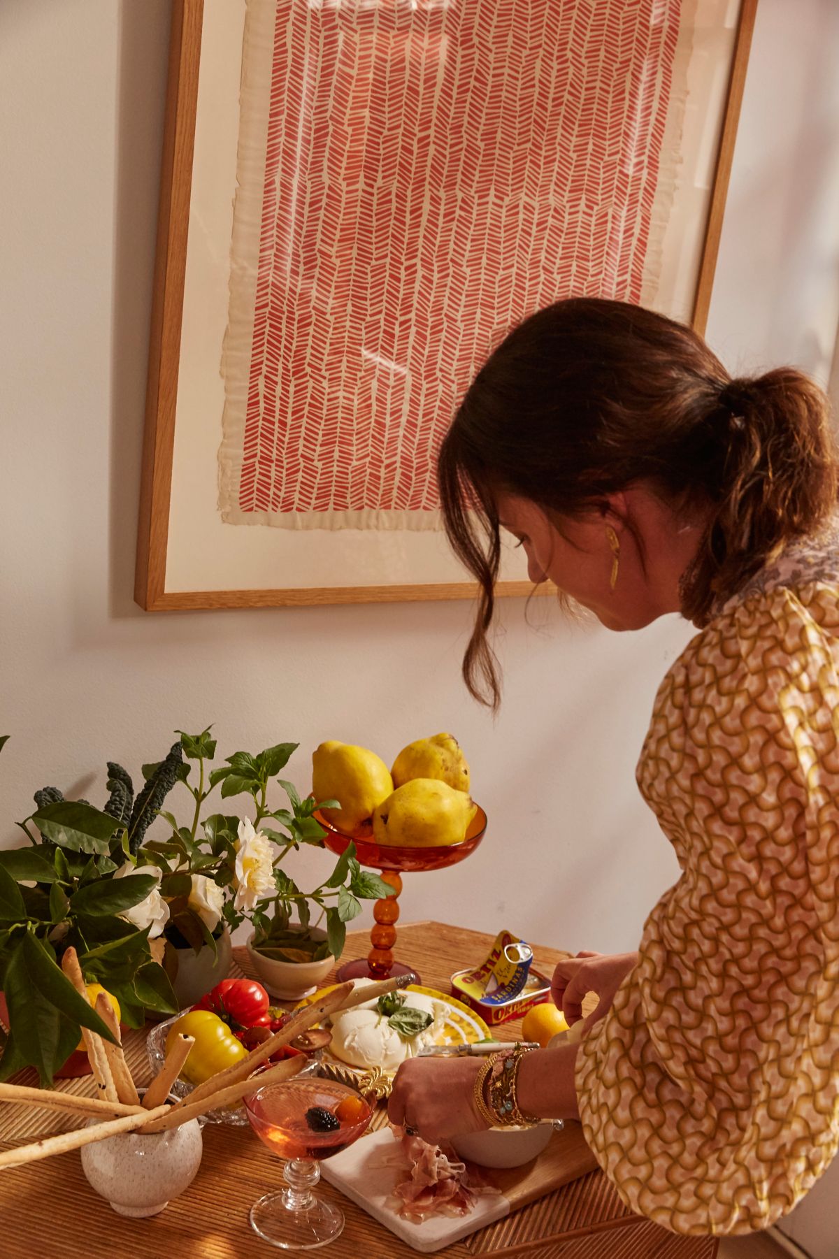 Like any good host, Tori will clean the house from top to bottom to make the space as inviting as possible. 'I'll always pull from my glassware selection too,” she says, “and style the table with foliage, flowers and herbs from the garden. There'll almost always be candles too.”