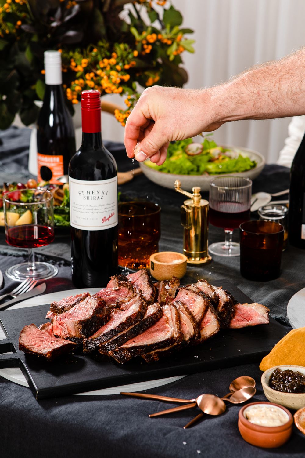 Taking over his studio, the table is set for the semi-annual boys catchup and Hayden’s shaking Filthy Martinis and sizzling steaks.