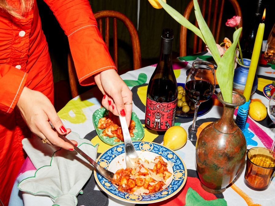 “When everyone is sitting down with their entree, then I'll go into the kitchen and whip up the pastas and then just bring them out as I make them. The kind of pasta will be based on what I find fresh, and then I’ll side it with some greens or roast veggies. I like to stick to whatever I’m drinking, so I’ll stay with margs, but other people like wine, so I'll probably have wine on the table just to serve those people. I’ll outsource the dessert. I don't make that. A girl knows what she's good at. I'll get a tiramisu or a tart, or even just sorbet with fresh mint and strawberries.”