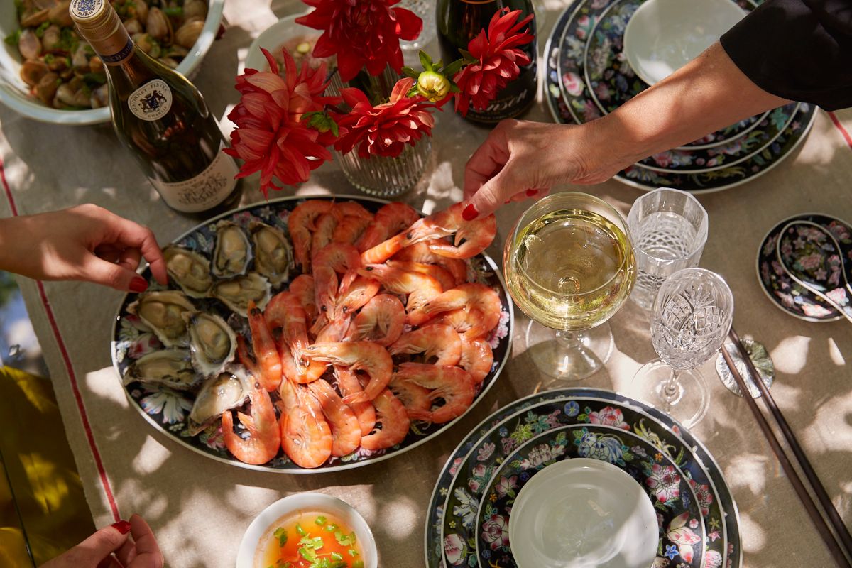 We’ll head out to the garden. It’s where I most like to entertain. I’ll usually bring out our Japanese hibachi grill and cook whatever produce is delicious and in season. I love cooking whole fish and crustaceans over binchotan charcoal with some icy cold Monsuta Okinawa Premium draft beer. For this occasion, we’ll start with something snacky and delicious. Fried zucchini flowers stuffed with scallop and drenched with chilli oil, oysters with a few different sauces and a pile of fresh prawns. We’ll be drinking beers and a bottle of Simonnet-Febvre Petit Chablis. Which is great with food.