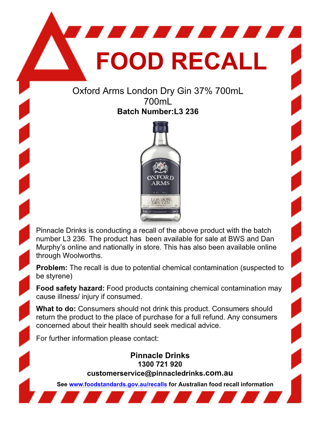 Product description: Pinnacle Drinks is conducting a recall of the above product with the batch number L3 236. The product has been available for sale at BWS and Dan Murphy’s online and nationally in store. This has also been available online through Woolworths.