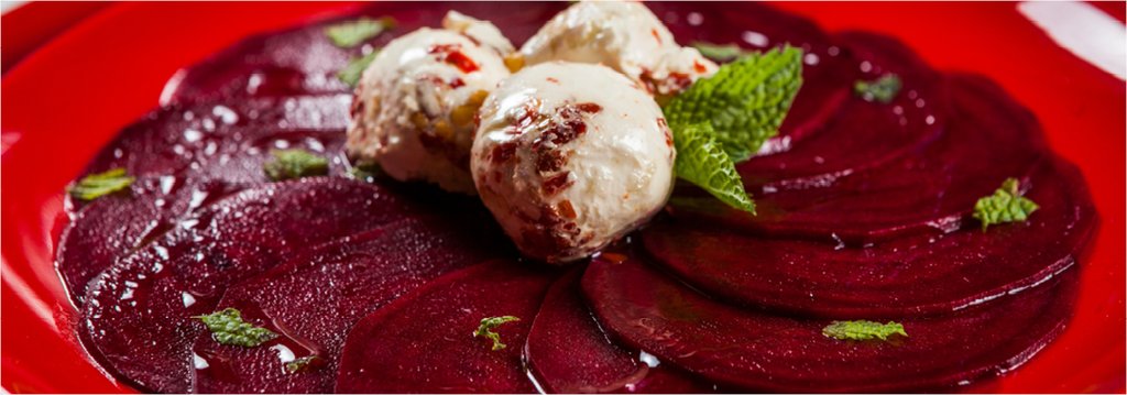 - Lay the beetroot slices out on a flat platter. Top with pinches of goat cheese rolled into balls and coated in a little black pepper.
