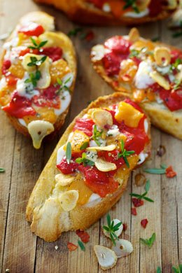 - Crumble the goat's cheese over the bread and top with the capsicum.
