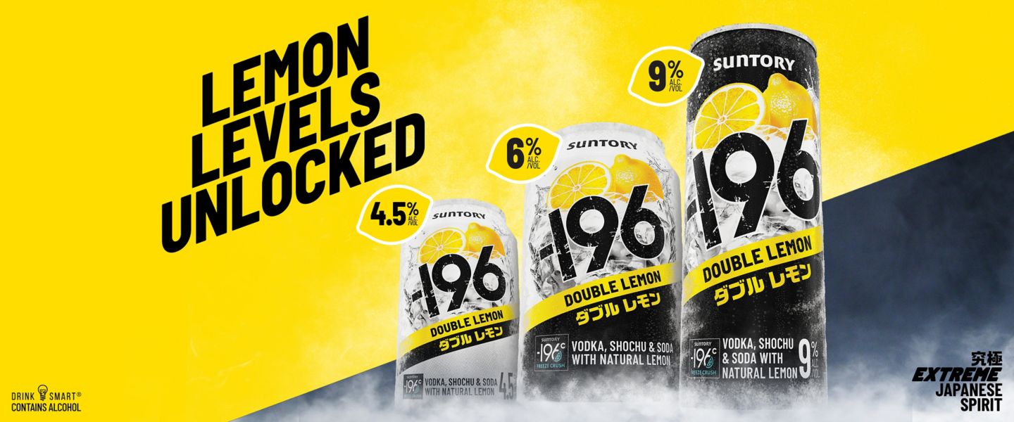 SUNTORY -196 DOUBLE LEMON IS NOW AVAILABLE IN THREE ABV FORMATS: 4.5%, 6% AND 9%! THERE'S A DOUBLE LEMON LEVEL TO UNLOCK EVERY OCCASION!